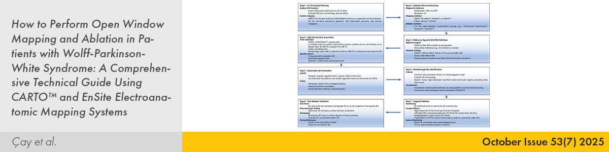 | 8. | How to Perform Open Window Mapping and Ablation in Patients with Wolff-Parkinson-White Syndrome: A Comprehensive Technical Guide Using CARTO™ and EnSite Electroanatomic Mapping Systems Serkan Çay, Meryem Kara, Serhat Koca, Özcan Özeke, Elif Hande Özcan Çetin, Ahmet Korkmaz, Fırat Özcan, Serkan Topaloğlu PMID: 40965147 doi: 10.5543/tkda.2025.14636 Pages 524 - 535