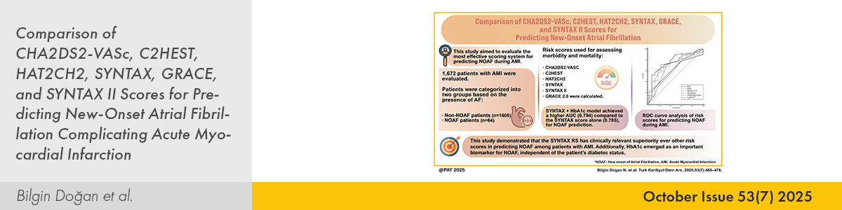 | 1. | Comparison of CHA2DS2-VASc, C2HEST, HAT2CH2, SYNTAX, GRACE, and SYNTAX II Scores for Predicting New-Onset Atrial Fibrillation Complicating Acute Myocardial Infarction Nazile Bilgin Doğan, Abdullah Kadir Dolu, Selim Ekinci, Ersin Çağrı Şimşek PMID: 40746089 doi: 10.5543/tkda.2025.38852 Pages 465 - 476