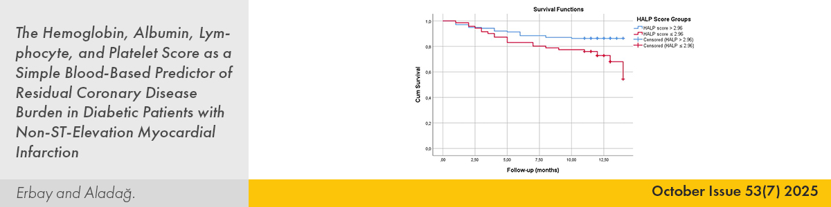 3. | The Hemoglobin, Albumin, Lymphocyte, and Platelet Score as a Simple Blood-Based Predictor of Residual Coronary Disease Burden in Diabetic Patients with Non-ST-Elevation Myocardial Infarction İlke Erbay, Pelin Aladağ PMID: 40772580 doi: 10.5543/tkda.2025.71080 Pages 483 - 491