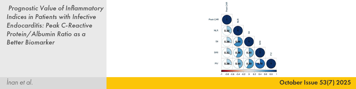5. | Prognostic Value of Inflammatory Indices in Patients with Infective Endocarditis: Peak C-Reactive Protein/Albumin Ratio as a Better Biomarker Duygu İnan, Alev Kılıçgedik, Ayşe İrem Demirtola Mammadli, Arslan Erdoğan, Duygu Genç Albayrak, Funda Özlem Karabulut, Sevil Tuğrul Yavuz, Fatmatuz Zehra Eroğlu, Cemal Ozanalp, Ahmet İlker Tekkeşin, Ömer Genç PMID: 40926628 doi: 10.5543/tkda.2025.85356 Pages 501 - 509