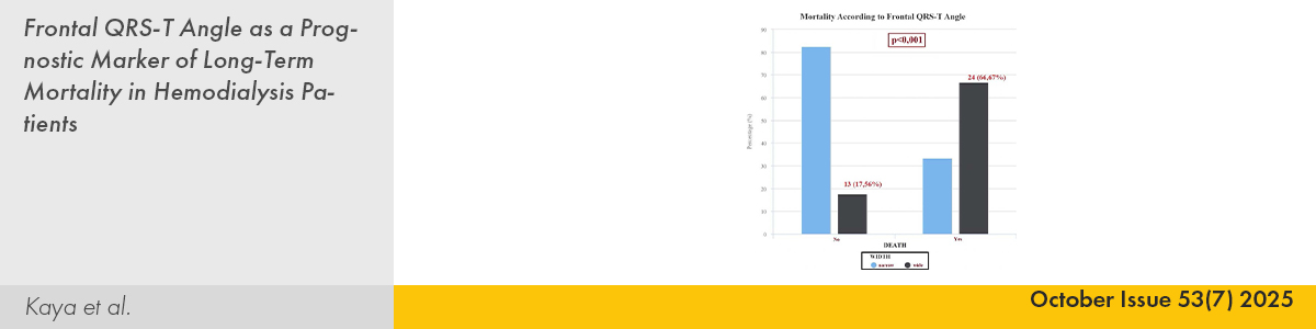 6. | Frontal QRS-T Angle as a Prognostic Marker of Long-Term Mortality in Hemodialysis Patients Çağlar Kaya, Mustafa Ebik, Cihan Öztürk, Merve Akbulut Çakır, Emirhan Çakır, İlhan Kılıç PMID: 40741978 doi: 10.5543/tkda.2025.98252 Pages 510 - 517
