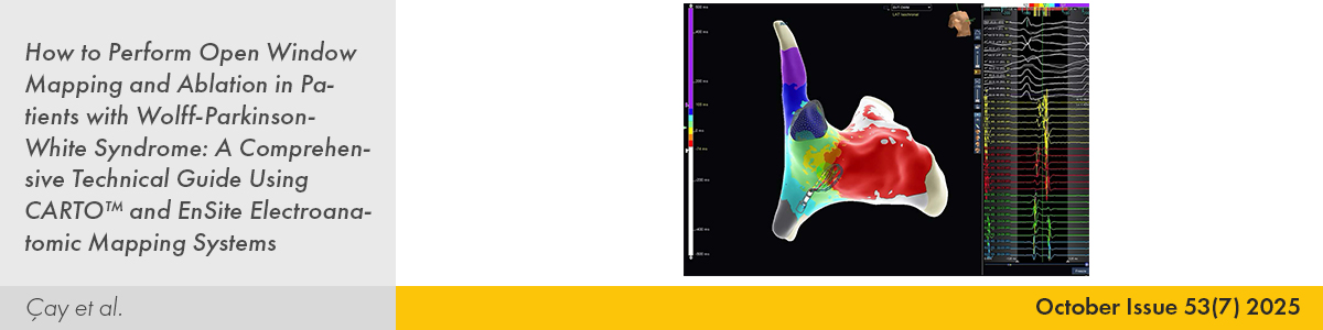 8. | How to Perform Open Window Mapping and Ablation in Patients with Wolff-Parkinson-White Syndrome: A Comprehensive Technical Guide Using CARTO™ and EnSite Electroanatomic Mapping Systems Serkan Çay, Meryem Kara, Serhat Koca, Özcan Özeke, Elif Hande Özcan Çetin, Ahmet Korkmaz, Fırat Özcan, Serkan Topaloğlu PMID: 40965147 doi: 10.5543/tkda.2025.14636 Pages 524 - 535